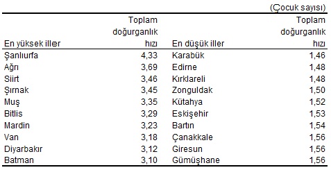 doğurganlık hızının en düşük olduğu il ise 1,46 çocukla Karabük oldu. Bu ili
