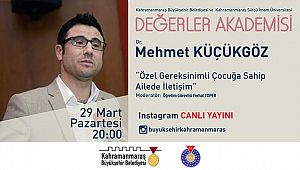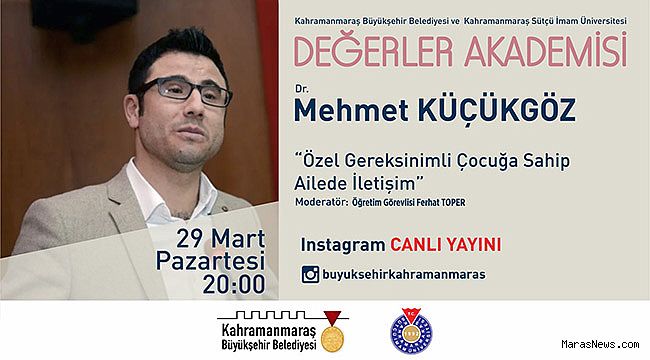 Kahramanmaraş Büyükşehir Belediyesi ve Kahramanmaraş Sütçü İmam Üniversitesi işbirliği ile gerçekleştirilen Değerler Akademisi, 29 Mart Pazartesi günü Dr. Mehmet Küçükgöz’ün konuk olacağı programla devam edecek. Saat 20.00’da Büyükşehir Belediyesi Instagram hesabından canlı yayınlanacak programda, ‘Özel Gereksinimli Çocuğa Sahip Ailede İletişim’ üzerine konuşulacak. Öğr. Gör. Ferhat Toper moderatörlüğünde gerçekleştirilecek programda, özel gereksinimli çocuklarla ideal iletişim ve yaklaşım biçimleri, çocukların sosyal hayatta etkinliği ve aile bağlarının güçlendirilmesi gibi pek çok konu masaya yatırılacak.