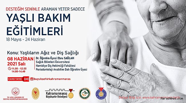 Kahramanmaraş Büyükşehir Belediyesi’nin katkılarıyla düzenlenen ‘Yaşlı Bakım Eğitimleri’ seminerleri devam ediyor. Aile Çalışma ve Sosyal Hizmetler İl Müdürlüğü, Kahramanmaraş Valiliği ve Sütçü İmam Üniversitesi işbirliğiyle düzenlenen seminerin konuğu Sağlık Bilimleri Üniversitesi Hamidiye Diş Hekimliği Fakültesi Periodontoloji Anabilim Dalı Öğretim Üyesi Ebru Sağlam olacak. 8 Haziran Salı günü (yarın) 11.00 – 12.00 ile 14.00 – 14.40 saatleri arasında gerçekleştirilecek olan program Büyükşehir Belediyesi’nin Instagram hesabından canlı yayınlanacak. Gerçekleştirilecek programda yaşlılarda ağız ve diş sağlığının önemi, diş sağlığını tehdit eden unsurlar ve çözüm önerileri gibi pek çok konu masaya yatırılacak.