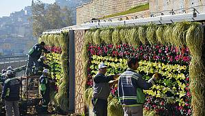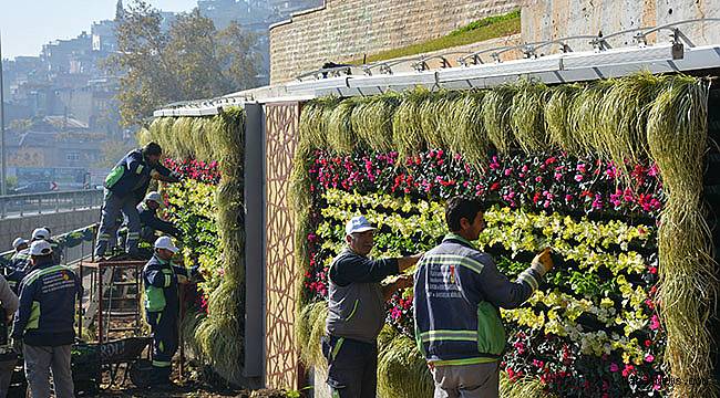 Kavşak’ın etrafını çevreleyen duvarlar asma çiçeklerle donatıldı.