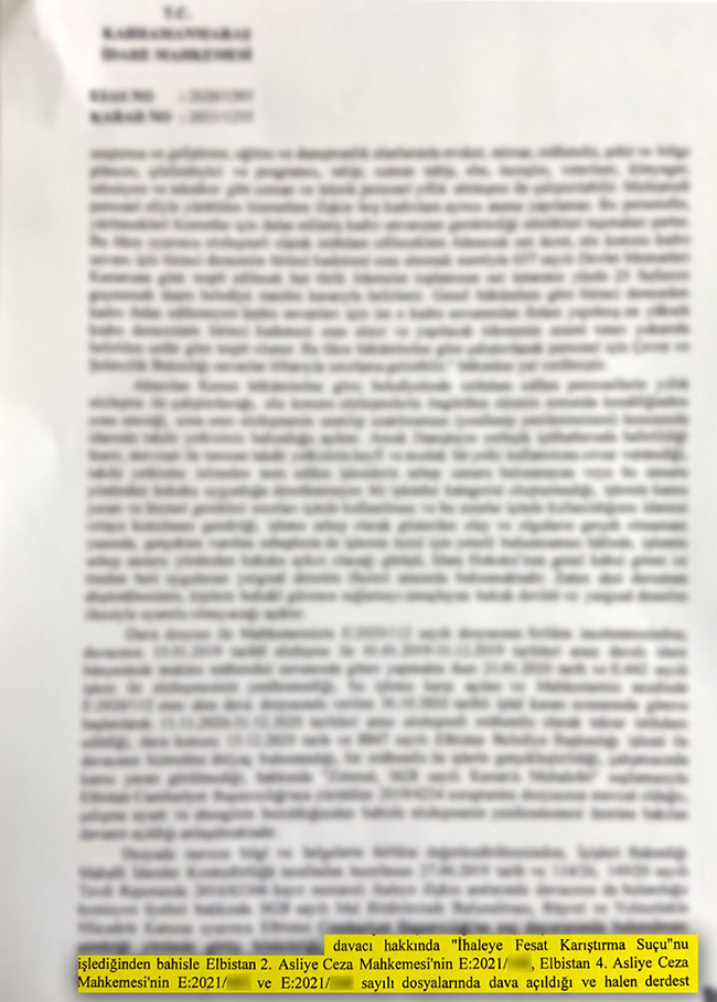 Ayrıca İ.D hakkında iki ayrı davada ihaleye fesat karıştırma suçundan yargılamanın devam ettiği ve bu nedenle Kahramanmaraş İdare Mahkemesi’nin özlük ve parasal hakların ödenmesi talebinin de reddine karar verildiği belirtildi.