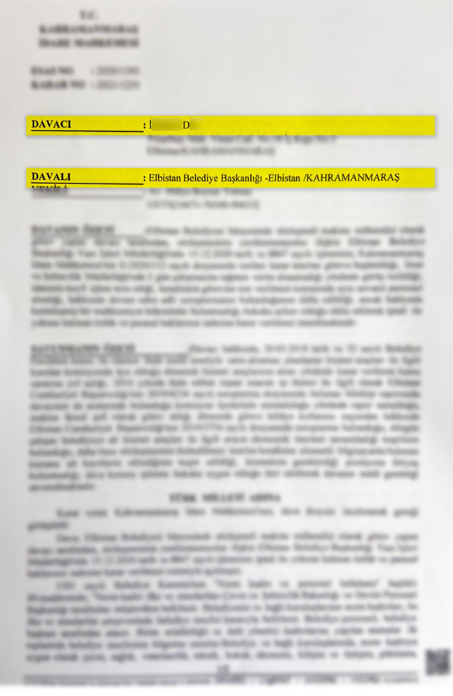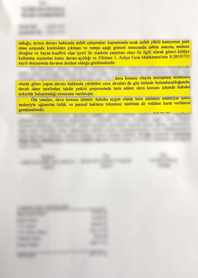 Kahramanmaraş İdare Mahkemesi’nin sözleşmeli mühendis olarak görev yapan İ.D. hakkında yürütülen ceza davalarını da göz önünde bulundurarak Elbistan Belediyesi tarafından takdir yetkisi çerçevesinde tesis edilen dava konusu işlemi hukuka uygun bulmuştur. Öte yandan da, dava konusu işlemin hukuka uygun olarak tesis edilmesi nedeniyle uğranılan özlük ve parasal hakların ödenmesi talebinin de reddine karar vermiştir. Lehimize sonuçlanan bu davaya ilişkin belediyemiz herhangi bir tazminat ödemeye mahkum edilmemiştir.