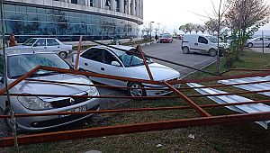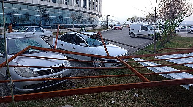 Elbistan ilçesinde akşam saatlerinde etkili olan şiddetli rüzgar nedeniyle Karaelbistan Beldesi’nde yer alan devlet hastanesinin çatısının bir bölümü park halindeki araçların üzerine düştü.