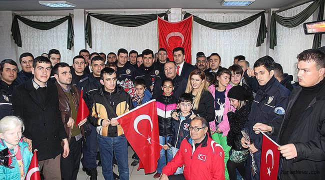 öğrenciler polis amcalarına cevşen takarak çiçek hediye ettiler.