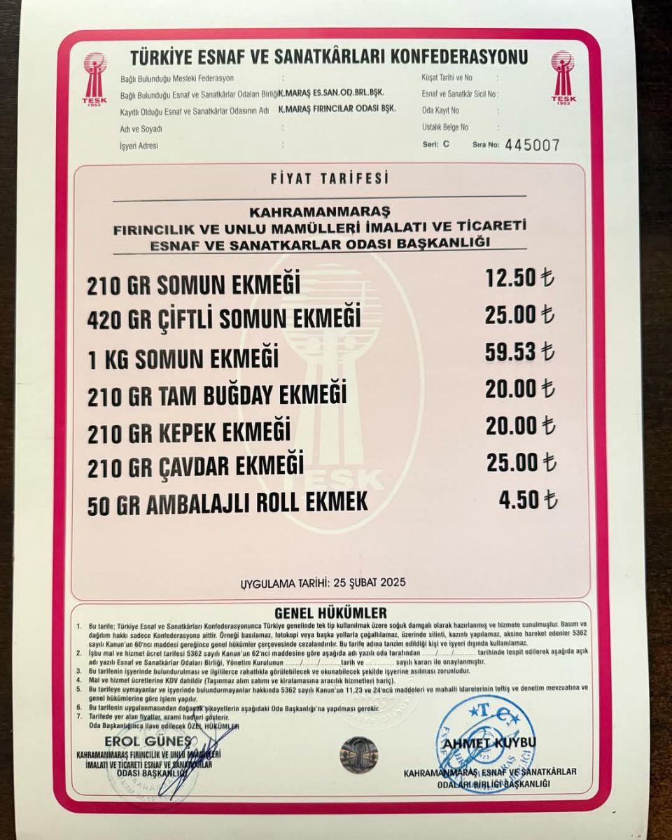 Kahramanmaraş Fırıncılar Odası Başkanlığı tarafından belirlenen yeni fiyatlar kamuoyuna duyuruldu. Zam, özellikle Ramazan ayında artan ekmek tüketimi göz önünde bulundurularak vatandaşların bütçesini daha da zorlayacak gibi görünüyor.