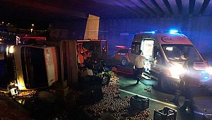 Kamyonun devrilmesi sonucu sürücü Serkan Dinç yaralandı.