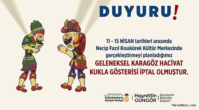 Kahramanmaraş Büyükşehir Belediyesi, okulların ara tatile girdiği dönemde 11 – 15 Nisan tarihleri arasında hafta içi her gün Necip Fazıl Kısakürek Kültür Merkezi’nde alt salonda saat 11.00 – 13.00 ve 15.00’te öğrencilerle buluşturulması planlanan geleneksel Karagöz - Hacivat kukla gösterilerinin çeşitli nedenlerden dolayı iptal edildiğini duyurdu. Kültür Spor ve Turizm Dairesi Başkanlığı’ndan yapılan açıklamada, “11 – 15 Nisan tarihleri arasında miniklerle buluşturulması planlanan geleneksel Karagöz – Hacivat oyunu çeşitli nedenlerden dolayı iptal edilmiştir. Miniklerimizin eğlenceli bir ara tatil geçirmesi için çeşitli etkinlikler düzenlemeye devam edeceğiz” ifadelerine yer verildi.