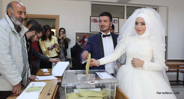 Kocaeli’nin İzmit ilçesinde düğünleri olan Selim ile Büşra Pınar çifti, nikah masasında 'Evet' demeden önce vatandaşlık vazifesini yerine getirmek için sandıkta 'Evet' dedi. Düğün salonunu gitmeden önce oy kullanmaya gelen gelin kullanacağı sandığa gelinliği ile geldi. Gelin Büşra Pınar, İzmit Bekirdere Mahallesi'nde bulunan Mimar Sinan Ortaokulu 2082 numaralı sandıkta oy kullandı. Oy kullanırken sırada bekleyen gelini damat yalnız bırakmadı.