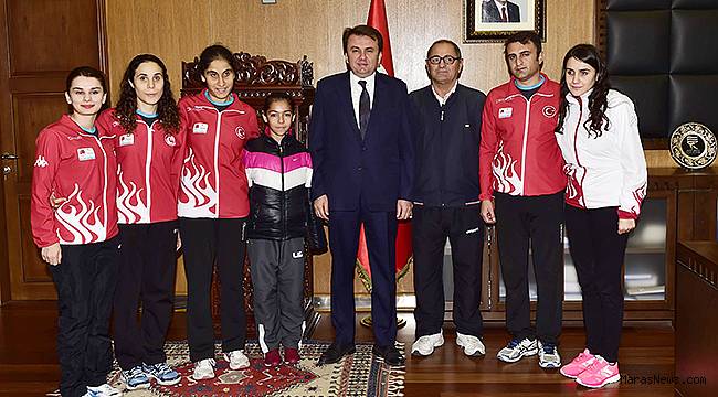 sporcuları tek tek tebrik ederek, altın taktı ve başarılarının devamını diledi.