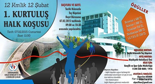 Kahramanmaraş'ın Kurtuluşu kapsamında 1. kurtuluş koşusu 07.02.2015 tarihinde saat 09:00 da yapılacak. Kahramanmaraş Büyükşehir Belediyesi ve TFFHGD’nin ev sahipliği yaptığı Kurtuluş koşusu tarihi taş köprüsü Başlangıç noktası olurken bitiş noktası olarak ise Kahramanmaraş Büyükşehir Belediyesi binası önü olarak belirlendi. 12 yaş üstü tüm halkın davet edildiği koşuya katılmak isteyenlerden ise sağlık raporu getirmesi mecburi tutuldu. Maraton ise 09.00 ile 10.30 arası yapılacak. Ödüllü Maraton koşusunda 1. Olana 1500 TL ödül, 2.ci ye 1000 TL, 3.cü ye 750 TL, 4.cü ye 500 TL verilecek Maratonda 5,6,7,8,9,10’uncuya 250 TL ödül verilecek.