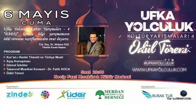 Törende, Dr. Fatih Koca Türk Tasavvuf Musikisi eserlerini seslendirecek. Zinde Gençlik, Spor ve İzcilik Kulübü ile Son Peygamber Platformu tarafından 3 Nisan 2016 Pazar günü 81 İlimiz ve Lefkoşe’de yapılan; aynı zamanda 61 Ülkeden de online olarak katılımın sağlandığı 7’den 70’e her kesimden baba-oğul, dede-torunun birlikte katıldığı Ufka Yolculuk-4 Hadis Yarışmasının Ödülleri sahiplerini buluyor.