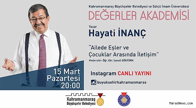 Kahramanmaraş Büyükşehir Belediyesi ve Kahramanmaraş Sütçü İmam Üniversitesi iş birliği ile gerçekleştirilecek Değerler Akademisi, 15 Mart Pazartesi günü başlıyor. Saat 20.00’da, Büyükşehir Belediyesi instagram hesabından canlı yayınlanacak programda Hayati İnanç, ‘Ailede Eşler ve Çocuklar Arasında İletişim’ üzerine konuşacak. KSÜ Öğretim Görevlisi İsmail Göktürk moderatörlüğünde gerçekleştirilecek çevrimiçi etkinlik ile ilgili olarak Sağlık ve Sosyal Hizmetler Dairesi Başkanlığı tarafından yapılan açıklamada, “KSÜ işbirliği ile gerçekleştirdiğimiz Değerler Akademisi’nde takvimi Yazar Hayati İnanç ile başlatıyoruz. 15 Mart Pazartesi 20.00’da gerçekleştirilecek etkinlik Büyükşehir Belediyesi instagram hesabından canlı yayınlanacak. Moderatörlüğünü KSÜ Öğr. Gör. İsmail Göktürk’ün yapacağı programda ‘Ailede Eşler ve Çocuklar Arasında İletişim’ konuşulacak. Tüm hemşehrilerimizi çevrimiçi gerçekleştireceğimiz bu etkinliğimize davet ediyoruz” ifadeleri kullanıldı.