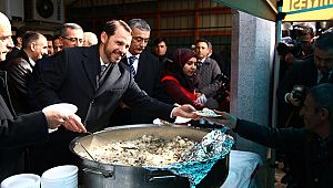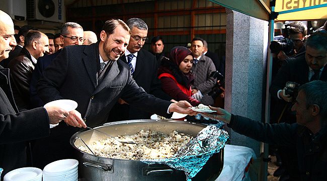 Albayrak, kazanın başına geçerek pilav dağıtılmasına yardım etti.