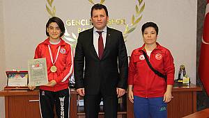 Yılmaz ve Antrenörü Halide Ay Gençlik Hizmetleri ve Spor İl Müdürü Ali İhsan