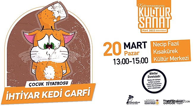 Kahramanmaraş Büyükşehir Belediyesi Mart Kültür Sanat Etkinlikleri kapsamında tiyatro gösterilerinden konsere, konferanstan söyleşiye kadar birbirinden renkli etkinlikler sanatseverlerle buluşturuluyor. Bu kapsamda, 20 Mart Pazar günü (yarın) ‘İhtiyar Kedi Garfi’ adlı çocuk tiyatrosu miniklerle buluşacak. Necip Fazıl Kısakürek Kültür Merkezi’nde düzenlenecek etkinlik saat 13.00 ve 15.00 olmak üzere 2 seans şeklinde sahnelenecek. Yaşlılara saygı ve hürmet, hayvan hakları gibi pek çok değerimizi sahne dili ile miniklere anlatacak olan oyunun ücretsiz biletleri NFK’dan ücretsiz olarak temin edilebiliyor.
