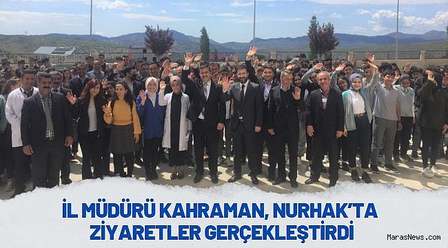 Beraberindeki Müdür Yardımcıları Halit Demirtaş, Önder Erdem Gökşen ve Akif Bulut ile Nurhak ilçesine ziyaret gerçekleştiren İl Millî Eğitim Müdürü Yusuf Kahraman’ın ilk durağı Nurhak Çok Programlı Anadolu Lisesi oldu. Burada idareci, öğretmen ve öğrenciler ile bir araya gelen İl Millî Eğitim Müdürü Yusuf Kahraman, ardından Nurhak Öğretmenevi ve Akşam Sanat Okulu Müdürlüğü'nde İlçe Milli Eğitim Müdürleri ile toplantı gerçekleştirdi.