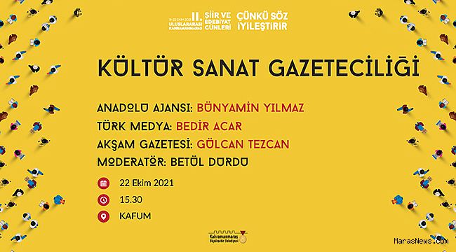 Bugün KAFUM’da iki panelin de düzenleneceğine dikkat çekilen açıklamanın devamında ise, “2. Uluslararası Kahramanmaraş Şiir ve Edebiyat Günleri’miz kapsamında düzenleyeceğimiz ‘Kültür Sanat Gazeteciliği’ başlıklı panelimiz bugün 15.30’da, ‘41 Kere İstiklal: İstiklal Marşı Şerhi’ başlığıyla düzenleyeceğimiz panel ise yine bugün 17.00’da Kahramanmaraş Fuar Merkezi’nde (KAFUM) gerçekleştirilecektir” ifadelerine yer verildi.