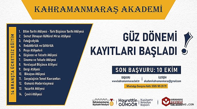 Kahramanmaraş Büyükşehir Belediyesi, sosyal belediyecilik hizmetleri kapsamında kültür sanat etkinliklerini aralıksız sürdürüyor. Bu kapsamda hayata geçirilen Kahramanmaraş Akademi’de Güz Dönemi kayıtları başladı. Dönem boyunca kursiyerlere alanında uzman eğitmenler tarafından 14 farklı atölyede eğitim verilecek. Fotoğrafçılık, Redaktörlük ve Editörlük, Proje, Düşünce ve Felsefe, Sinema ve Felsefe, Varoluşsal Düşünce, Dergi, Diksiyon, Bilim Tarihi ve Türk Düşünce Tarihi, Sosyolojinin Temel Kavramları, Osmanlı Modernleşmesi, Somut Olmayan Kültürel Miras, Yazarlık ile Çeviri atölyelerinden oluşan kurslarda başvurular çevrimiçi olarak alınıyor.