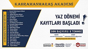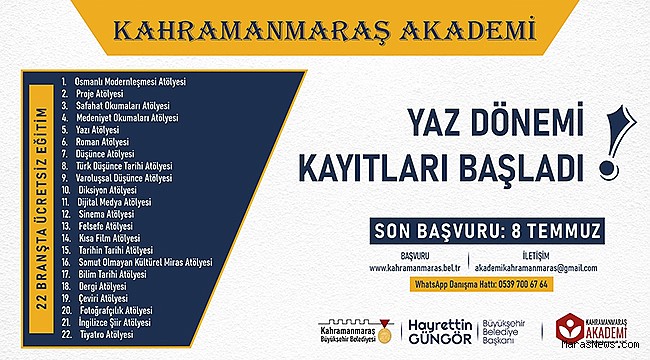 Kahramanmaraş Büyükşehir Belediyesi tarafından düzenlenen Kahramanmaraş Akademi’de Yaz Dönemi kayıtları başladı. Alanında uzman eğitmenler tarafından kursiyerlere verilmesi planlanan eğitimler arasında Osmanlı Modernleşmesi, Proje, Safahat Okumaları, Medeniyet Okumaları, Yazı, Roman, Düşünce, Türk Düşünce Tarihi, Varoluşsal Düşünce, Diksiyon, Dijital Medya, Sinema, Felsefe, Kısa Film, Tarihin Tarihi, Somut Olmayan Kültürel Miras, Bilim Tarihi, Dergi, Çeviri, Fotoğrafçılık, Tiyatro ve İngilizce Şiir Atölyeleri yer alıyor. 15 yaş ve üzeri vatandaşların katılım sağlayabileceği atölyelere Büyükşehir Belediyesi internet sitesi üzerinden (https://kahramanmaras.bel.tr) çevrimiçi başvuru yapılabiliyor. Başvurularda son gün 8 Temmuz Cuma. Kültür Spor ve Turizm Dairesi Başkanlığı’ndan yapılan açıklamada, 18 Temmuz – 18 Eylül tarihleri arasında gerçekleştirilecek eğitimlere ilişkin detaylı bilgiye 0539 700 67 64 numaralı WhatsApp danışma hattı üzerinden ulaşılabileceği belirtildi.