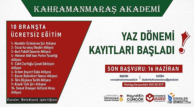 Şehrin imarı, inşası ve iskânı noktasında tüm alanlarda çalışmalarını kesintisiz sürdüren Kahramanmaraş Büyükşehir Belediyesi, şiir ve edebiyatın başkentinde kültür sanat etkinliklerine derinlik kazandırmak ve bireylerin sanatsal gelişimlerine katkı sağlamak için de kültür sanat etkinliklerine devam ediyor. Deprem öncesi güz, bahar ve yaz dönemlerinde rutin olarak düzenlenen ve binlerce kursiyere ulaşan Kahramanmaraş Akademi, deprem sonrasında da yeni eğitim dönemine başlıyor. Esenler Belediyesi’nin de destekleriyle; Alaeddin Özdenören Şiir Atölyesi, Sezai Karakoç Eleştiri Atölyesi, Nuri Pakdil Deneme Atölyesi, Mehmet Akif İnan Portre Yazarlığı Atölyesi, Cahit Zarifoğlu Çocuk Edebiyatı Atölyesi, Erdem Beyazıt Öykü Atölyesi, Rasim Özdenören Roman Atölyesi, Türk Düşünce Tarihi Atölyesi, Klasik Türk Şiiri Atölyesi ve Somut Olmayan Kültürel Miras Atölyesi olmak üzere toplamda 10 farklı branşta ücretsiz olarak düzenlenecek kurslara kayıtlar başladı. https://kahramanmaras.bel.tr/duyuru/2023/06/09/kahramanmaras-akademi-yaz-donemi-basvuru-formu internet adresinden çevrimiçi olarak yapılabilen başvurularda son gün 16 Haziran Cuma. Büyükşehir Belediyesi’nden yapılan açıklamada, eğitimlere ve başvurulara ilişkin detaylı bilgiye 0505 185 20 79 numaralı WhatsApp danışma hattından ulaşılabileceği belirtildi.