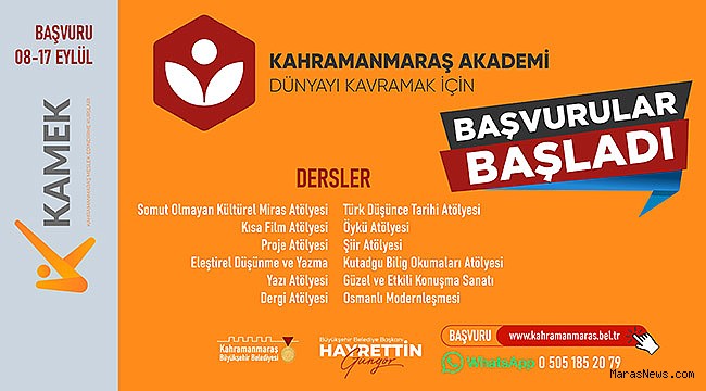 Kahramanmaraş Büyükşehir Belediyesi’nin; kültür sanat etkinliklerine derinlik kazandırmak, bireylerin kişisel ve sanatsal gelişimlerine katkı sağlamak için her yıl düzenli olarak vatandaşlarla buluşturduğu Kahramanmaraş Akademi’de Güz Dönemi kayıtları başladı. Tarihi Köker Konağı’nda düzenlenecek Kahramanmaraş Akademi’de alanında uzman eğitmenler tarafından katılımcılara; Somut Olmayan Kültürel Miras Atölyesi, Kısa Film Atölyesi, Proje Atölyesi, Eleştirel Düşünme ve Yazma, Yazı Atölyesi, Dergi Atölyesi, Türk Düşünce Tarihi Atölyesi, Osmanlı Modernleşmesi, Güzel ve Etkili Konuşma Sanatı, Öykü Atölyesi, Şiir Atölyesi ve Kutadgu Bilig Okumaları Atölyesi olmak üzere toplam 12 farklı branşta ücretsiz eğitim verilecek. 17 Eylül Pazar gününe kadar devam edecek başvurular, https://kahramanmaras.bel.tr/duyuru/2023/09/08/kahramanmaras-akademi-guz-donemi-basvurusu internet adresinden çevrimiçi yapılabiliyor. Başvuruların tamamlanmasının ardından 2 Ekim Pazartesi günü başlayacak eğitimlere ilişkin detaylı bilgiye 0505 185 20 79 numaralı Whatsapp danışma hattından ulaşılabileceği belirtildi.