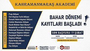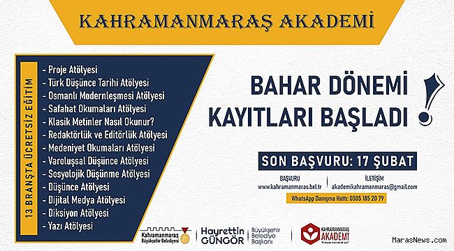 Kahramanmaraş Büyükşehir Belediyesi tarafından düzenlenen Kahramanmaraş Akademi de 2022 Bahar Dönemi başvuruları başladı. Alanında uzman eğitmenler tarafından kursiyerlere verilecek eğitimler arasında Proje Atölyesi, Türk Düşünce Tarihi Atölyesi, Osmanlı Modernleşmesi Atölyesi, Safahat Okumaları Atölyesi, Klasik Metinler Nasıl Okunur? Editörlük ve Redaktörlük Atölyesi, Medeniyet Okumaları Atölyesi, Varoluşsal Düşünce Atölyesi, Sosyolojik Düşünme Atölyesi, Düşünce Atölyesi, Dijital Medya Atölyesi, Diksiyon Atölyesi ve Yazı Atölyesi yer alıyor. Başvurular 12 – 17 Şubat tarihleri Büyükşehir Belediyesi’nin internet sitesi üzerinden (https://kahramanmaras.bel.tr) yapılabilecek. Yedi Güzel Adam Edebiyat Müzesi’nde verilecek olan eğitimler 19 Şubat - 23 Nisan tarihlerinde gerçekleştirilecek. Yapılan açıklamada eğitimler ve başvurular için bilgi almak isteyen kursiyerlerin 0505 185 20 79 whatsapp Danışma Hattı üzerinden ilgili birimlere ulaşılabileceği belirtildi.