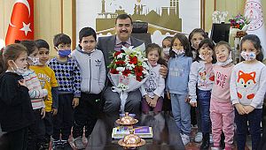 Kahramanmaraş Anaokulu öğretmen ve öğrencileri, 24 Kasım Öğretmenler Günü münasebetiyle İl Millî Eğitim Müdürü Yusuf Kahraman’ı makamında ziyaret ederek çiçek takdim ettiler.