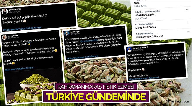 Kahramanmaraş Büyükşehir Belediyesi’nin başvurusuyla 15 Şubat 2021 tarihinde Türk Patent ve Marka Kurumu tarafından tescillenen “Kahramanmaraş Fıstık Ezmesi” Türkiye gündemine oturdu. Şekerleme olarak üretilen, iç ve dış piyasada rağbet gören Fıstık Ezmesi, Twitter uygulamasında “Trend Topic” oldu. Binlerce Twitter kullanıcısı, Kahramanmaraş Fıstık Ezmesi ve Maraş FıstıkEzmesi mesajlarıyla paylaşımlar gerçekleştirdi. Kahramanmaraş Büyükşehir Belediye Başkanı Hayrettin Güngör ve AK Parti Kahramanmaraş İl Başkanı Fırat Görgel, Twitter’dan paylaşım yapanlar arasında yer aldı. Kahramanmaraş Büyükşehir Belediyesi tarafından Sütçü İmam Üniversitesi işbirliğiyle sürdürülen çalışmalar neticesinde ‘Kahramanmaraş Fıstık Ezmesi’ şehrin coğrafi işaretli ürünleri arasında yerini almıştı.
