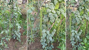 Yeşilova Mahallesi'nde Galip Baran'ın bahçesinde yetiştirdiği 90 santimetre ve üzeri boyutlarıyla dikkat çeken fasulyeler, 1 metre uzunluğa ulaşmak üzere.