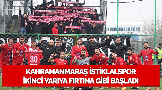 Bölgesel Amatör Lig 2’nci grupta sezonun ilk yarısını namağlup lider tamamlayan Kahramanmaraş İstiklalspor, ikinci yarının ilk haftasında Elazığ temsilcisi Aksaray Gençlikspor ile karşılaştı. Elazığ Gençlik Merkezi Sahası’nda oynanan müsabakaya Kahramanmaraş İstiklalspor hızlı başladı. Kırmızı beyazlılar, yeni transferi Vedat Erçin’in 13’üncü dakikada kaydettiği golle müsabakada 1-0’lık üstünlüğü yakaladı. Golden sonra taraftar desteğini de arkasına alarak baskısını iyice artıran İstiklalspor; 30’uncu dakikada Vedat Erçin, 37’de Salih Kazan ve 44’te Tugay Tiryaki’nin ayağından bulduğu gollerle ilk yarıyı 4-1’lik skorla üstün tamamladı. Soğuk havaya rağmen temposunu hiç düşürmeyen Kahramanmaraş İstiklalspor, 58’inci dakikada takımın başarılı forveti Vedat Erçin’in kaydettiği golle rakibi karşısında 5-1’lik skoru yakaladı. Müsabakanın devamında Saruhan Bolat ve Hakan Doğan’ın kaydettiği gollerle rakibini 7-1’lik net bir skorla mağlup eden Kahramanmaraş İstiklalspor, puanını 40’a çıkararak grupta namağlup liderliğini sürdürdü.