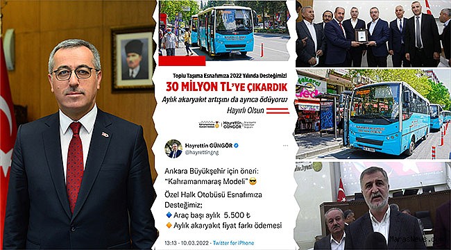 Ankara’da Özel Halk Otobüsü esnafının sefere çıkmayacağını açıklaması, ülke genelinde büyük yankı uyandırdı. Ankara Büyükşehir Belediye Başkanı Mansur Yavaş yaptığı açıklamayla vatandaşları özel araçlarını kullanmaya davet etti ve çözüm arayışlarının sürdüğünü belirtti. Pandemiden bu yana Kahramanmaraş’ta ise Özel Halk Otobüsü esnaflarına yönelik Türkiye’ye örnek bir uygulama sürdürülüyor. Büyükşehir Belediye Başkanı Hayrettin Güngör sosyal medyadan yaptığı paylaşımda, “Ankara Büyükşehir için çözüm Kahramanmaraş Modeli. Esnafımıza aylık 5 bin 500 TL destek sağlıyoruz. Bunun yanı sıra aylık akaryakıt fiyat farkı ödemesi de gerçekleştiriyoruz” ifadelerini kullandı.