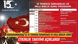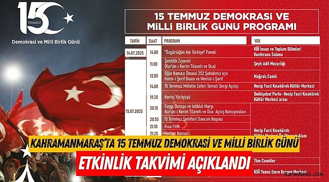 Kahramanmaraş Büyükşehir Belediyesi, Valilik ve paydaş kurumlar iş birliğiyle, 15 Temmuz Demokrasi ve Milli Birlik Günü dolayısıyla kapsamlı bir anma programı düzenlenecek. Demokrasiye, milli iradeye ve bağımsızlığa sahip çıkan kahraman şehitleri anmak ve milletin destansı direnişini unutturmamak amacıyla gerçekleştirilecek etkinlikler, 14 Temmuz Pazartesi günü başlayacak ve 16 Temmuz Çarşamba gününe kadar devam edecek.