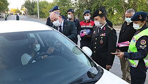 Vali Ömer Faruk Coşkun, emniyet kemeri denetimi sırasında sürücülere kampanyayla ilgili bilgilendirici broşür ve maske dağıtırken, araçlardaki çocuklara kırmızı düdük ve oyuncak hediyesinde bulundu.