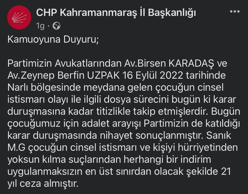 CHP Kahramanmaraş İl Teşkilatı tarafından sosyal medya üzerinden tapılan açıklamada; Partimizin Avukatlarından Av.Birsen Karataş ve Av.Zeynep Berfin Uzpak 16 Eylül 2022 tarihinde Narlı bölgesinde meydana gelen çocuğun cinsel istismarı olayı ile ilgili dosya sürecini bugün ki karar duruşmasına kadar titizlikle takip etmişlerdir. Bugün çocuğumuz için adalet arayışı partimizin de katıldığı karar duruşmasında nihayet sonuçlanmıştır. Sanık M.G çocuğun cinsel istismarı ve kişiyi hürriyetinden yoksun kılma suçlarından herhangi bir indirim uygulanmaksızın en üst sınırdan olacak şekilde 21 yıl ceza almıştır” denildi.