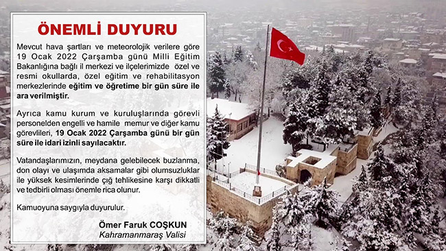 Yoğun kar yağışı nedeniyle Türkoğlu ilçesinde 21, Dulkadiroğlu ilçesinde 25 mahallenin okulunda bugün öğleden sonra yüz yüze eğitime ara verildi.