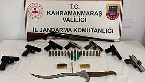 Yapılan aramada, 7 adet ruhsatsız 9 mm tabanca, 7 adet tabanca şarjörü, 1 adet ruhsatsız av tüfeği, 70 adet 9 mm tabanca fişeği ve 1 adet kılıç ele geçirildi.