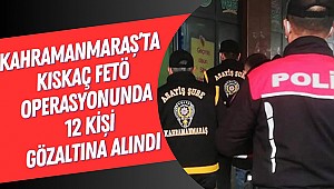 Edinilen bilgiye göre, FETÖ Silahlı Terör Örgütünün yurt genelinde faaliyetlerinin deşifre edilmesi ve engellenmesine yönelik Cumhuriyet Başsavcılığı koordinesinde yapılan çalışmalar kapsamında; Kahramanmaraş İl Emniyet Müdürlüğü Terörle Mücadele Şube Müdürlüğü, Kaçakçılık ve Organize Suçlarla Mücadele Şube Müdürlüğü ve İstihbarat Şube Müdürlüğünce FETÖ Terör Örgütü içerisinde faaliyette bulundukları tespit edilen 12 şüpheli gözaltına alındı. Şüphelilerin emniyetteki işlemlerinin sürdüğü öğrenildi.