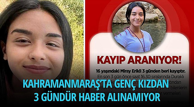 Dulkadiroğlu Mahallesinde yaşayan 16 yaşındaki Miray Erikli’nin ailesi kendisinden 3 günden beri ailesi haber alamıyor.