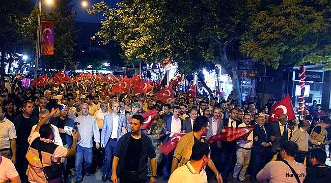 Kahramanmaraş Valiliği ve Büyükşehir Belediyesinin çağrısı üzerine ellerinde Türk bayraklarıyla tarihi Ulu Cami önünde toplanan binlerce kişi yürüyüşe geçti.