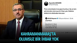 Sabah saatlerinde Adana merkezli yaşanan 5,5 şiddetindeki deprem Kahramanmaraş’ta da hissedildi. Büyükşehir Belediye Başkanı Hayrettin Güngör, şehirde olumsuz bir ihbar olmadığını belirterek, “Tüm vatandaşlarımıza geçmiş olsun. Şu an için şehrimizde olumsuz bir ihbar yok. Rabbim milletimizi afetlerden korusun” ifadelerini kullandı.
