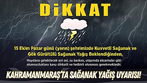 Kahramanmaraş Büyükşehir Belediyesi Afet Koordinasyon Merkezi, 15 Ekim Pazar günü (yarın) Kahramanmaraş’ta kuvvetli sağanak yağış beklendiğini açıkladı. Sabah saatlerinde başlayacağı öngörülen yağışların gün boyu devam edebileceği belirtilerek yapılan açıklamada, “Yerel olarak kuvvetli sağanak ve gök gürültülü sağanak yağış beklendiğinden sel, su baskını, ulaşımda aksamalar, yıldırım, yerel dolu yağışı ve yağış anında kuvvetli rüzgâr gibi olumsuzluklara karşı dikkatli ve tedbirli olunması gerekmektedir” ifadelerine yer verildi. Büyükşehir Belediyesinden yapılan açıklamada ise; yağışlara karşı tedbirlerin alındığı, herhangi bir olumsuzluk yaşanması durumunda vatandaşların 112 Acil Çağrı Merkezi’nden İtfaiye ekiplerine ve ALO 153’ten Afet Koordinasyon Merkezi’ne (AKOM) ulaşabilecekleri belirtildi.