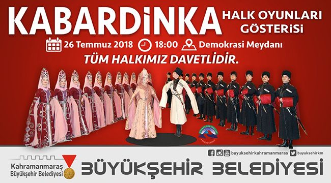 KABARDİNKA Halk Dansları Topluluğu, 26 Temmuz Perşembe günüBüyükşehir Beleye Başkanlığınca organize edilecek olan programda; Trabzon Bulvarı’nda“Festival Kortej Yürüyüşü”Demokrasi Meydanı’nda“Otantik müzik eşliğinde nostaljik dans gösterisi”sunacaktır.