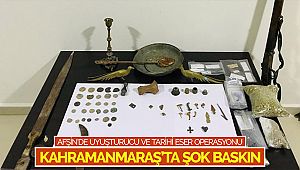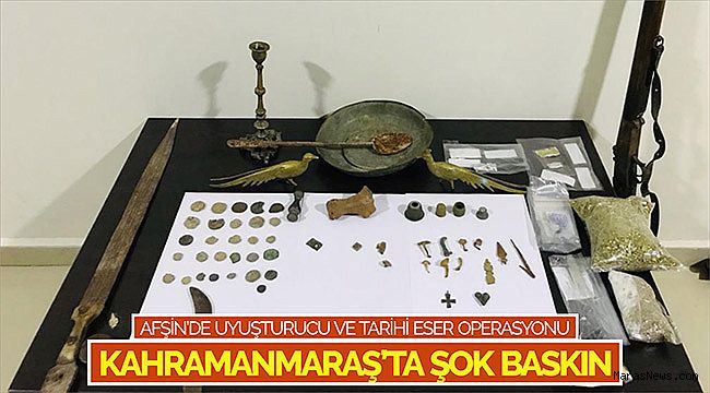 Edinilen bilgiye göre, Afşin Cumhuriyet Savcılığı Koordinesinde, İlçe Emniyet Müdürlüğü ekipleri tarafından Fatih S.(37) isimli şahıs takibe alındı. Farklı suçlardan sabıkası olan şahsın uyuşturucu sattığını belirleyen polis, şahsın kısa süre önce kiraladığı gizli evine şok operasyon yaptı.ilçeye bağlı Beyceğiz Mahallesindeki adreste yapılan aramada 258 gram bonzai, uyuşturucu paketlemekte kullanılan çok sayıda folyo, paketler halinde folyoya sarılı ateş buz maddesi, ruhsatsız tüfek ve tarihi eser niteliği olduğu değerlendirilen 33 adet sikke, 9 adet broş, 2 adet bakır kuş figürü, 2 adet metal kılıç,1 adet taş hayvan figürü,1 adet şamdan,1 adet metal haç sembolü,1 adet metal kalp figürü,1 adet metal mızrak ucu,1 adet metal üzerinde arapça yazılar bulunan taş,5 adet tarihi metal parçalar olmak üzere toplam 57 parça geçirildi. Üzerinde yapılan aramada bir miktar uyuşturucu da ele geçirilen şüpheli gözaltına alındı.