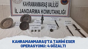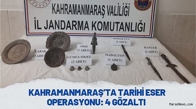 Edinilen bilgiye göre, İl Jandarma Komutanlığı ekipleri, ilçeye bağlı Korkmaz Mahallesinde fiziki takip sonrası durdurduğu araçta arama yaptı. Yapılan aramada, Roma dönemine ait olduğu değerlendirilen 3 adet çanak tabak, 2 adet hançer, 1 adet mızrak ucu, (1) adet tanrıça heykeli, (3) adet gümüş (sikke) para, 1 adet bakır madalyon bulundu. Tarihi eserler muhafaza altına alınırken, araçta bulunan H.K (32), E.K (34), A.D (32) ve E.B (35) gözaltına alındı.