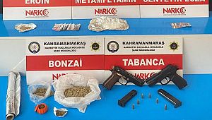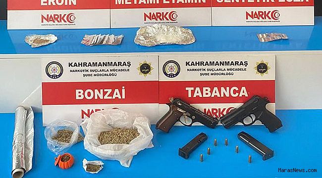 Alınan bilgilere göre, İl Emniyet Müdürlüğü Narkotik Suçlarla Mücadele Şube Müdürlüğü görevlilerince gerçekleştirilen operasyonda takibe alınan E.B. (27) uyuşturucu alışverişi esnasında suçüstü yakalandı. Kahramanmaraş Cumhuriyet Başsavcılığı ile koordineli olarak gerçekleştirilen operasyonda yakalanan şüphelinin ikametinde çeşitli miktarlarda farklı uyuşturucu maddeler, 2 adet tabanca ile 6 adet fişek ve uyuşturucu paketlemede kullanılan materyaller ele geçirildi.