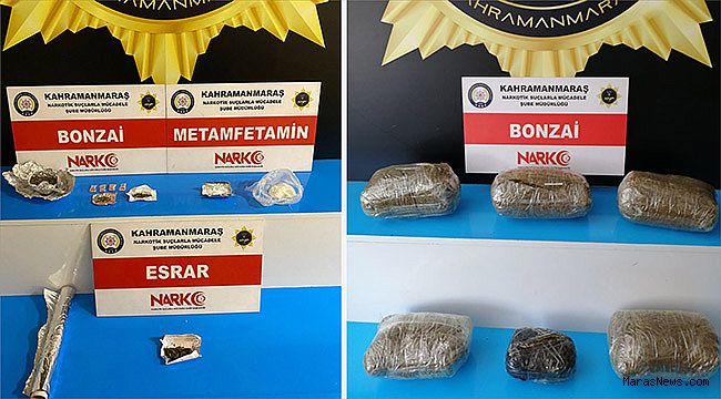 Alınan bilgilere göre, İl Emniyet Müdürlüğü Narkotik ekipleri, sokakta uyuşturucu sattığı tespit edilen R.K. ve yüklü miktarda uyuşturucuyu piyasaya sürmek üzere olan C.Ö. suçüstü yakaladı. Kahramanmaraş Cumhuriyet Başsavcılığı ile koordineli olarak gerçekleştirilen operasyonda yakalanan 2 şüphelinin araçlarında ve ikametlerinde narkotik köpeği “ALFİ” ile yapılan aramada 4 kilo 50 gram sentetik kanebinoid (Bonzai) maddesi ve çeşitli miktarlarda farklı uyuşturucu maddeler ele geçirildi. Operasyonlarda yakalanıp adli mercilere sevk edilen C.Ö. (64) ve R.K. (33) çıkarıldıkları mahkeme tarafından tutuklanarak cezaevine konuldu.