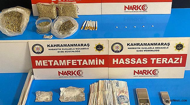 Alınan bilgilere göre, İl Emniyet Müdürlüğü Narkotik Suçlarla Mücadele Şube Müdürlüğü görevlilerince gerçekleştirilen operasyonda, yapılan fiziki takipte M.D. (32) uyuşturucu alışverişi esnasında suçüstü yakalandı. Kahramanmaraş Cumhuriyet Başsavcılığı ile koordineli olarak gerçekleştirilen operasyonda yakalanan şüphelinin ikametinde narkotik köpeği “ALFİ” ile yapılan aramada çeşitli miktarlarda uyuşturucu madde ile birlikte, iki adet hassas teraziyle uyuşturucudan elde edilen 7 bin TL ele geçirildi. Gözaltına alınan şüpheli sevk edildiği adli makamlarca tutuklanarak cezaevine konuldu.