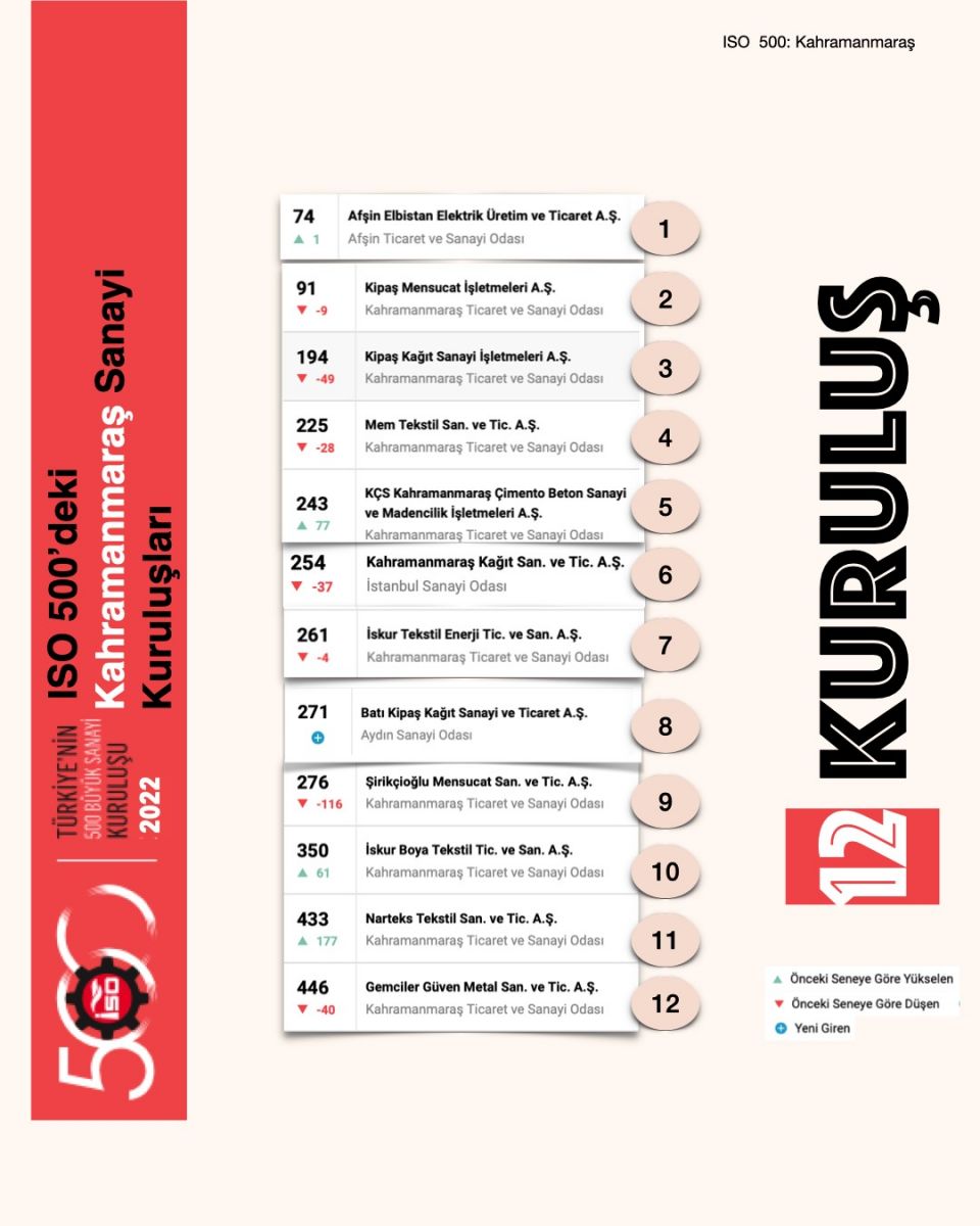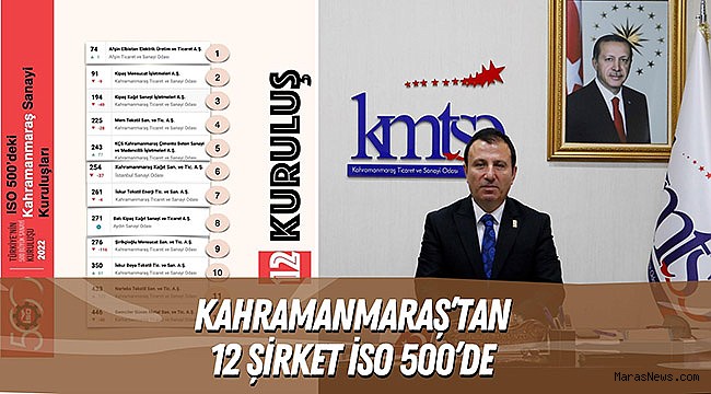 İstanbul Sanayi Odası (İSO) tarafından her yıl gerçekleştirilen "Türkiye'nin İlk 500 Büyük Sanayi Kuruluşu 2022" araştırma sonuçları açıklandı. Açıklanan listede Kahramanmaraş’tan 12 firma yer aldı. Sıralamaya giren tüm firmaları kutlayan KMTSO Başkanı Mustafa Buluntu, “Ülkemiz ekonomisine, ihracatına ve istihdamına sağladıkları büyük katkılardan dolayı firmalarımızı tebrik ediyor, başarılarının devamını diliyorum. Böylesine önemli bir listede, ilk 500 büyük sanayi kuruluşu arasında 12 şirketimizle temsil ediliyor olmak Kahramanmaraş’ımız için çok önemli. Listedeki Kahramanmaraşlı firmalarımızın sayısının artması için özveriyle çalışmaya devam edeceğiz” ifadelerini kullandı.