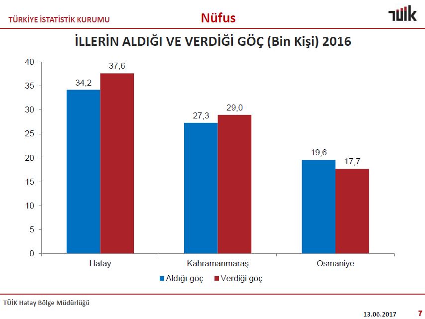 Türkiye İstatistik Kurumu (TÜİK) Hatay Bölge Müdürlüğü, Doğu Akdeniz Bölgesi’ne yönelik istatistiki bir çalışma yayımladı. TÜİK’in hazırladığı Hatay, Osmaniye ve Kahramanmaraş’a ait nüfus, eğitim, sağlık, doğum, ölüm, evlenme ve boşanma gibi birçok alanda yapılan araştırmada, Kahramanmaraş’ın verileri dikkat çekiyor. Kahramanmaraş’ta 2015-2016 yılları arasında nüfus artış hızı Türkiye ortalamasının üzerine çıktı. İlk defa nüfus artış hızı ortalaması Türkiye’nin üzerine çıkan Kahramanmaraş’ta 2015-2016 yılları arasında binde 14,5 artış yaşandı. 2016 yılında Kahramanmaraş’ın nüfus yoğunluğu yüzde 78 olarak kayıtlara geçti. Kahramanmaraş’ın da aralarında bulunduğu TR63 bölgesine bakıldığında Hanehalkı büyüklüğünde Kahramanmaraş, en yüksek ortalamayı yakaladı.