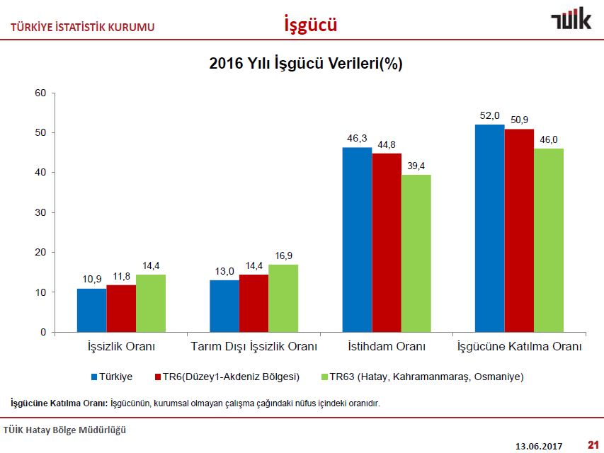 oranı yüzde 16.9 olan TR63 Bölgesi, yüzde 39.4 istihdam oranı ve yüzde 46 işgücüne